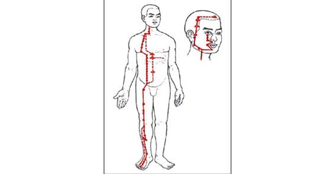 面部的胃經只是一個很小的局部,跟下面的整條胃經還沒有接通,還需要給它接通一下,接通點就在脖子上。