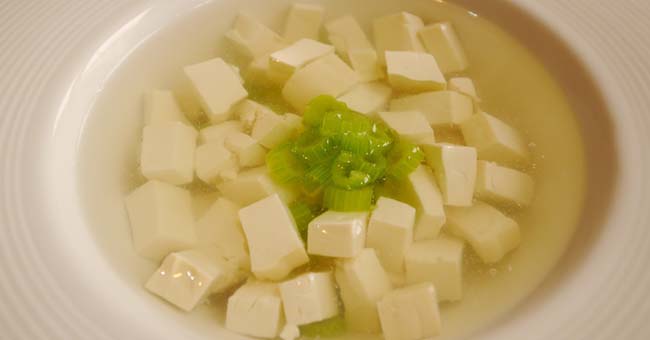 將鮮湯燒沸,放入豆腐和鹽之後再次煮沸,倒入豬肝燒熟,最後撒上蔥花和味精即可。