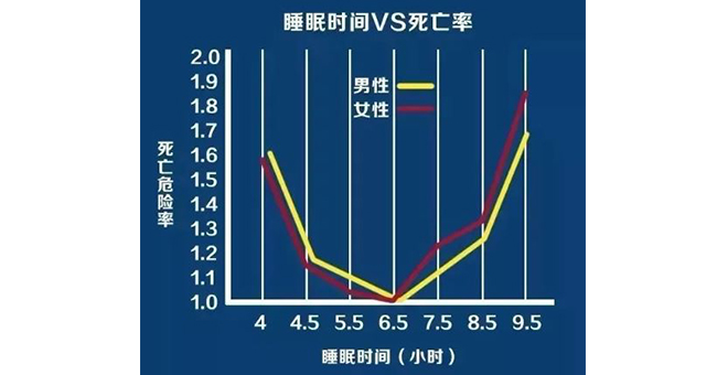 成年人睡眠時間在6.5~7.4小時之間,死亡率最低,而少於4.5小時或高於9.4小時,死亡率明顯增高。