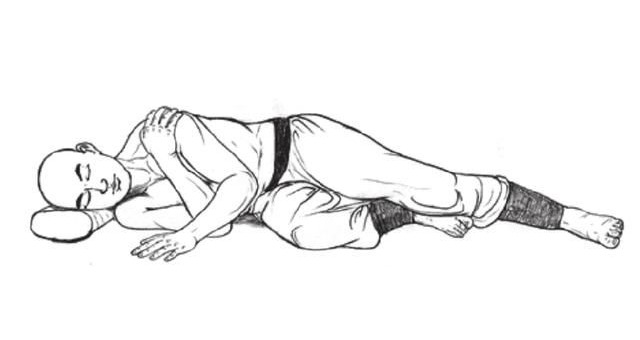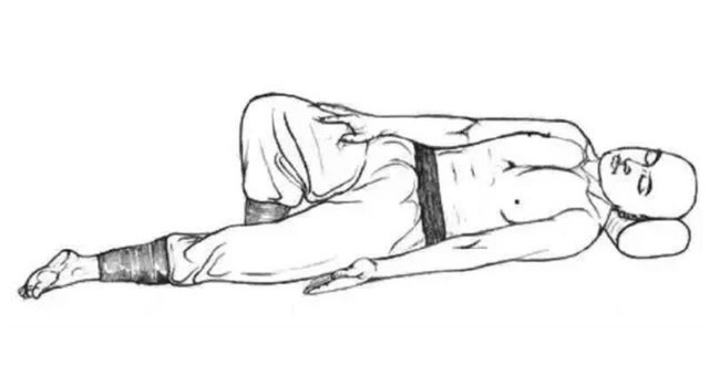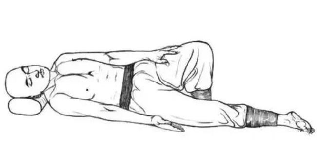 頭向右側身而臥,右腿屈,左腿伸;右手抱肩,左手覆按床面,自然舒適。